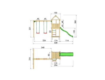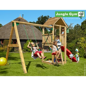 Offrez à vos enfants l’occasion de s’amuser pendant des heures et ceci grâce au Jungle Gym Club. Ce pavillon est équipé d'une tour de jeux avec double balançoire, toit en bois, échelle, toboggan avec raccordement d'eau en option et une bac à sable.
