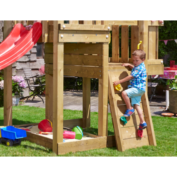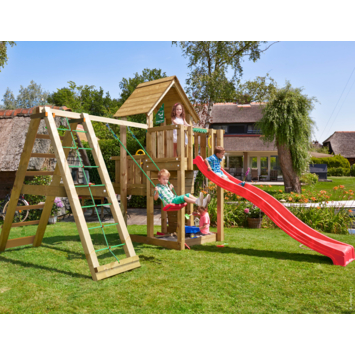 Une maison de jeu classique avec certain cachet composé d'un toit en bois intemporel, deux plates-formes, gouvernail, mur d'escalade avec des pierres d'escalade colorées, toboggan long avec raccordement d'eau en option et bac à sable. Astuce : Jungle Cubby est également disponible avec différentes extensions telles qu’un train ou une balançoire, ....