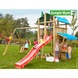 Une tour de jeu robuste équipée d’une grande plate-forme, un toit auvent et de nombreuses options telles qu'un long toboggan avec raccordement d'eau, un double toboggan et une petite boutique.
