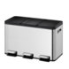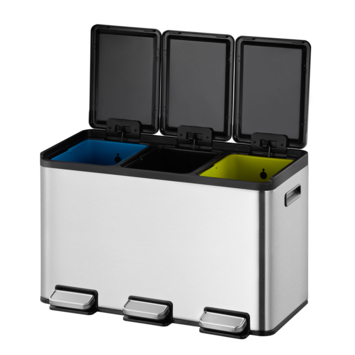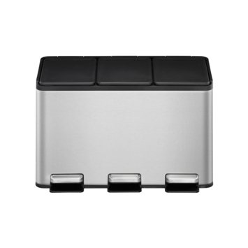 La poubelle à pédale Eko Essential Splitted 10+10+10L est une poubelle à pédale rectangulaire en acier inoxydable brossé avec un revêtement anti-empreintes digitales et équipée de couvercles en plastique à fermeture douce. Les trois pédales permettent un accès séparé aux seaux intérieurs en plastique (3x 10 litres) pour le tri des déchets. La fonction de maintien en position ouverte verrouille le couvercle pour faciliter le nettoyage de la poubelle ou le changement des sacs poubelles.