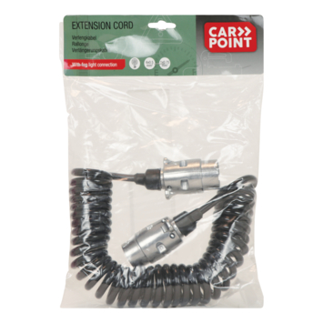La rallonge pour remorque Carpointe a 7 pôles : 6 de 0,5 mm² et 1 de 0,75 mm². Diamètre du câble : 1,2 cm. Longueur de la spirale : min. 65 cm, max. 270 cm. Avec connection pour phare anti-brouillard.
