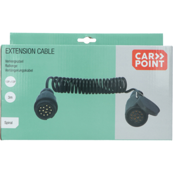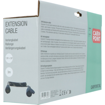 Câble d’extension en spirale pour remorque Carpoint 13 broches doté d’une section de câble de 0,5 mm². Ce câble en spirale est idéal pour une remorque, une semi-remorque ou une caravane. Utilisation facile grâce à sa forme en spirale. Extensible et flexible, ne traîne pas sur le sol. Longueur minimale de 33 centimètres et maximale de 2.97 mètres. Doté d’une fiche mâle en plastique à 13 broches et d’une prise femelle en plastique à 13 broches.