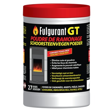 La poudre de ramonage Fulgurant GR détruit la suie et le goudron, prévient les feux de cheminée et augmente la capacité calorifique. Cette poudre convient aux cheminées, poêles encastrables, poêles, chaudières et conduits de cheminée.