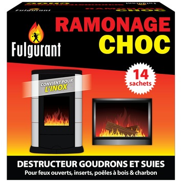 Le Ramoneur Choc Fulgurant élimine la suie et le goudron par catalyse. Il augmente la puissance et réduit les risques de feux de cheminée. Convient pour les cheminées, les encastrables, les poêles à bois, à charbon et les chaudières. L'emballage contient 14 sachets de 40 g chacun.