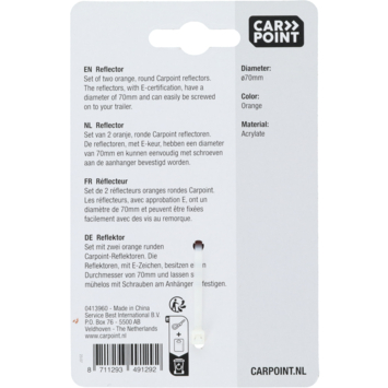 Réflecteurs Carpoint blancs pour fixation à l'avant d'une remorque ou d'une remorque. Ces réflecteurs en plastique ont un diamètre de 70 mm et une marque E. Équipé d'un trou de montage au centre du réflecteur afin qu'il puisse être facilement vissé. Les réflecteurs sont fournis par deux pièces sous blister.