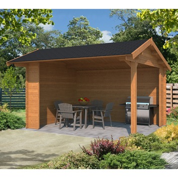 La remise ouverte en bois Hawaï est composée de planches de sapin nordique Nord-européen imprégnées par immersion en brun. Les mesures extérieures de cet abri sont 3 mètres 80 sur 3 mètres. Idéal donc pour y placer votre ensemble lounge trouvé chez GAMMA et pour y profiter pleinement du grand air, protégé du vent, du soleil et de la pluie. Bon à savoir : La remise est livrée avec revêtement de toit, ancrage de toit et instruction de montage. Également livrable en vert, gris platine/blanc, gris carbone/blanc ou non traité.