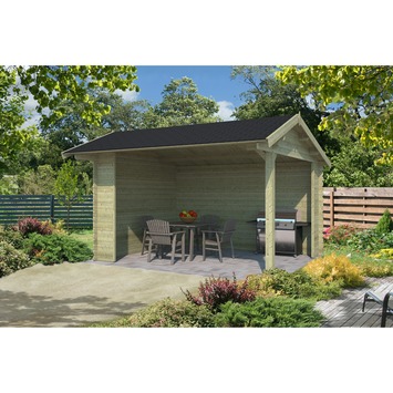 La remise ouverte en bois Hawaï est composée de planches de sapin nordique Nord-européen imprégnées par immersion en vert. Les mesures extérieures de cet abri sont 3 mètres 80 sur 3 mètres. Idéal donc pour y placer votre ensemble lounge trouvé chez GAMMA et pour y profiter pleinement du grand air, protégé du vent, du soleil et de la pluie. Bon à savoir : La remise est livrée avec revêtement de toit, ancrage de toit et instruction de montage. Également livrable en brun, gris platine/blanc, gris carbone/blanc ou non traité.