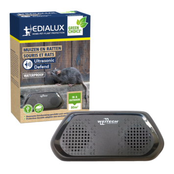 Répulsif ultrasonique contre souris et rats, pour l’intérieur et l’extérieur. Cet appareil étanche IP44 résiste à la pluie et à l’humidité et est donc idéal pour une utilisation dans le jardin et dans les espaces humides (caves, abris de jardin, granges). L’appareil est rechargeable par USB et a une autonomie de 15 à 24 jours, selon les réglages utilisés.