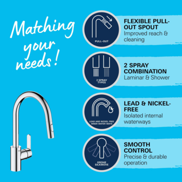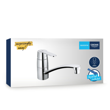 Le mitigeur de cuisine GROHE Get Chromé est très pratique. Les disques en céramique GROHE SilkMove intégrés au robinet permettent une utilisation souple et un réglage précis, d’une seule main, de la température et du débit souhaités. Les disques en céramique sont durables et ne requièrent en outre que peu d’entretien. Haut d’à peine 15,2 cm, ce robinet de cuisine offre malgré tout suffisamment de place dans l’évier du fait qu’il est orientable à 140°. Le limiteur de débit peut être réglé à l’installation de manière à réduire la consommation d’eau. Le robinet chromé possède un revêtement GROHE StarLight, plus résistant aux rayures que les revêtements chromés classiques. Grâce au système de montage rapide QuickFix, aux flexibles de raccordement et aux instructions de montage fournis, vous installerez facilement vous-même ce robinet. Un seul trou de montage suffit. Le design intemporel de ce robinet s’intégrera dans toutes les cuisines. Ce robinet pratique et de qualité bénéficie en outre d’une garantie d’usine de 5 ans.
