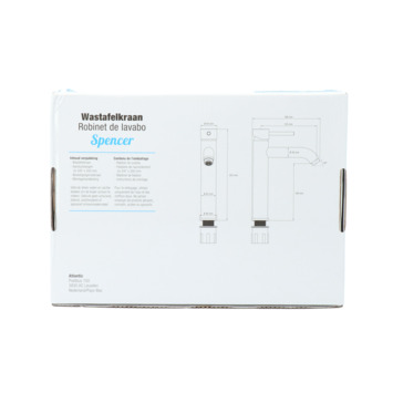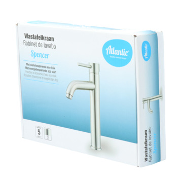 Le mitigeur de lavabo Atlantic Spencer en acier inoxydable se compose d'un mitigeur de lavabo de 25,5 cm de haut avec 2 tuyaux de raccordement flexibles, du matériel de montage et des instructions d'installation. Le robinet de lavabo Spencer est doté d'une commande à levier unique pratique, avec laquelle vous pouvez facilement tourner le robinet à la température souhaitée d'une seule main. Vous économisez de l'eau grâce à l'éco-clic intégré. Cette résistance intégrée dans la poignée garantit que vous ne réglez pas immédiatement le robinet sur le réglage de jet le plus élevé. Si vous voulez un jet plus dur, ouvrez simplement le levier davantage. L'Eco-start garantit que lorsque la poignée est au milieu, seule l'eau froide coule à travers le robinet, contrairement aux mitigeurs standard où l'eau chaude est mélangée en position médiane. En plus de l'eau par éco-click, vous économisez donc également de l'énergie (chaleur) par éco start. Le calcaire n'adhère pas à l'aérateur anticalcaire et vous pouvez facilement l'essuyer à la main. Ce robinet de lavabo droit a un aspect robuste grâce à sa finition brossée. Utilisez uniquement de l'eau et un chiffon doux pour nettoyer le robinet. N'utilisez pas de produits de nettoyage abrasifs, corrosifs, à base de vinaigre ou agressifs. Vous avez une garantie de 5 ans sur ce robinet.
