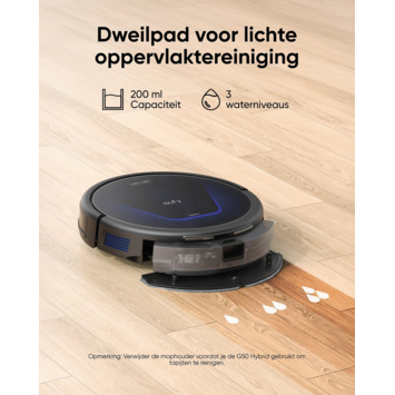 Le robot G50 Hybrid est conçu pour un nettoyage silencieux de niveau sonore de 55 dB seulement ce qui vous permet de travailler ou de vous détendre sans être dérangé. Le tampon laveur intégré permet un léger nettoyage des surfaces : un tampon doux et un réservoir d’eau de 200 ml nettoient délicatement les sols durs en éliminant les petites particules de saleté. (Remarque : retirez le support de la serpillière avant d’utiliser le G50 Hybrid pour nettoyer les tapis.)