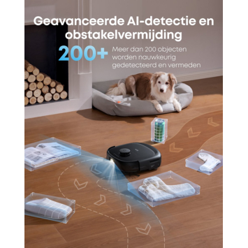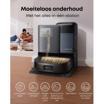 La station tout-en-un rend l'E25 vraiment sans intervention. Le robot se vide lui-même, lave et sèche les serpillières à l'air chaud et remplit le réservoir d'eau. La technologie AI See reconnaît plus de 200 objets et évite les obstacles. Le bras CornerRover nettoie même les coins et les bords difficiles d'accès. Tout fonctionne ensemble pour un nettoyage intelligent, silencieux et en profondeur.