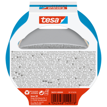 tesa a un ruban adhésif pour chaque emploi. Utilisez le ruban de masquage professional Outdoor (38 mm) pour des contours précis. Idéal si vous pratiquez la technique du colorblocking. Retirable sans résidus de colle jusqu’à 8 semaines après application.