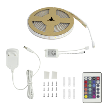 Apportez de la couleur et de l'ambiance à n'importe quelle pièce avec cette bande LED polyvalente. Cette bande offre des couleurs RVB vives et éclatantes, mais peut également être réglée sur du blanc chaud (3000 K), ce qui permet de l'adapter facilement à votre humeur ou à une occasion. La bande LED mesure 3 mètres de long et peut être variée à n'importe quel intensité souhaitée avec la télécommande incluse. Avec une valeur IP44, cette bande LED convient à la salle de bain ou à la cuisine. L'adaptateur a une valeur IP20, ce qui rend la bande LED uniquement adaptée à une utilisation en intérieur. Installation facile, car la bande LED possède une bande adhésive sur toute la longueur. La bande LED ne peut pas être raccourcie !