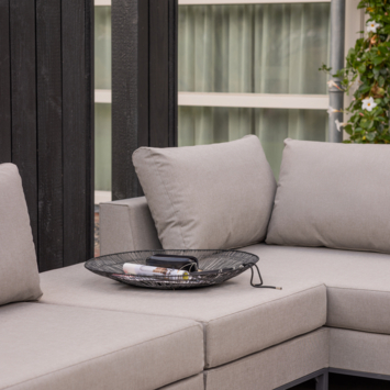 Ce canapé d'angle crée une ambiance ouverte et accueillante. L'assise profonde et les larges accoudoirs offrent un confort supplémentaire. Pour maintenir le canapé en bon état, il est recommandé de ranger les coussins en cas de pluie prolongée ou de les incliner pour accélérer le séchage. Le coin salon est livré dans un paquet compact et est facile à assembler. Pour prolonger sa durée de vie, nous conseillons de couvrir le canapé avec une housse de protection en hiver. Les taches peuvent être facilement nettoyées avec du savon neutre et un chiffon doux.