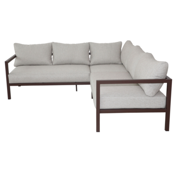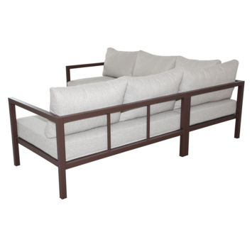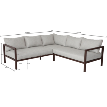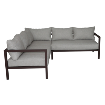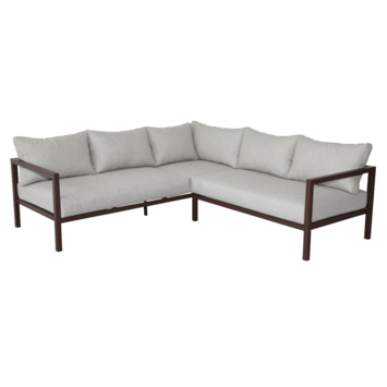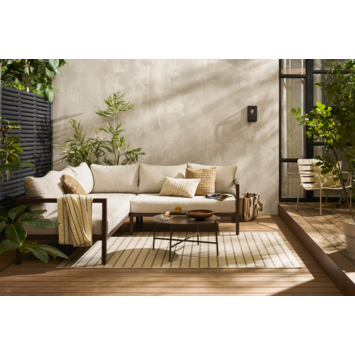 L’ensemble comprend un canapé d’angle accompagné de coussins d’assise et de dossier. Sa forme en L invite naturellement à s’installer côte à côte, à s’étendre ou à se réunir autour d’un moment chaleureux. Les coussins apportent un confort généreux, idéal pour prolonger les instants partagés en plein air.
