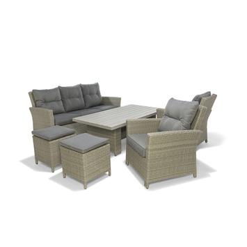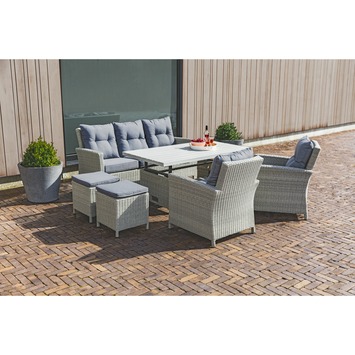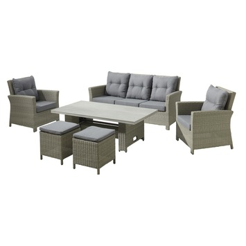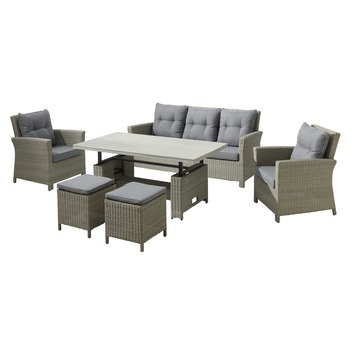 Vous hésitez entre en ensemble lounge ou un ensemble salle à manger ? L'ensemble lounge Marbella vous offre les deux en un ! L'ensemble pour 6 à 7 personnes est constitué de deux sièges, d'une banquette trois places, deux poufs et d'une table au look & feel rustique grâce à l'utilisation d'osier synthétique tressé de couleur grise. La table est le point de mire, réglable en hauteur, elle sert de table à manger ou de table basse lounge et s'adapte ainsi à merveille à vos besoins. Les sièges confortables disposent d'accoudoirs et de dossiers hauts ainsi que de coussins amovibles gris. Cet ensemble est prêt à vous accueillir pour un verre, le goûter ou un diner complet.