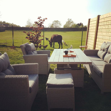 Fijne tuinset. Zit heerlijk. Alleen de tafel omhoog of omlaag doen lukt niet alleen.