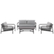 Il se compose d’un canapé deux places, de deux fauteuils et d’une table d’appoint.