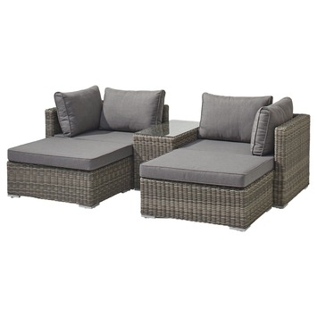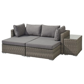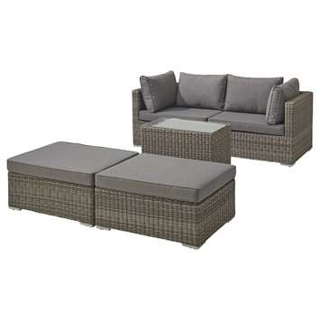 Vous cherchez un ensemble lounge polyvalent? Choisissez cet ensemble Messina, en vente exclusive chez GAMMA ! L'ensemble pour 2 à 4 personnes se compose d'une banquette, 2 poufs et une table d'appoint avec une tablette élégante en verre de sécurité que vous pouvez disposer de différentes manières. Créez ainsi votre composition favorite, d'après le nombre de personnes et la place disponible. En méridienne, petit salon 4 personnes pour s'asseoir, s'affaisser ou se coucher. L'ensemble en synthétique tressé gris foncé résiste aux intempéries et est livré avec des coussins confortables.