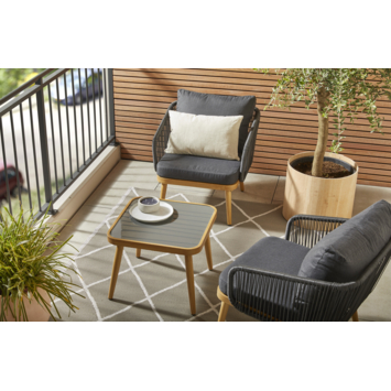 Le salon de jardin Renée vous permettra de profiter au maximum de votre jardin ou votre balcon l’été prochain. L’ensemble comprend une table et deux chaises, accompagnées de coussins gris. Avec une épaisseur de 16 cm pour les coussins de dossier et de 8 cm pour les coussins d’assise, cet ensemble de jardin de luxe est idéal pour profiter du beau temps.