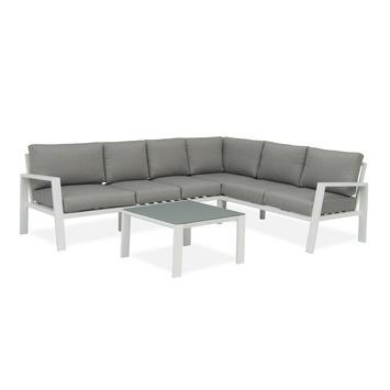 L'ensemble lounge San Marino est une exclusivité GAMMA qui vous séduira si vous aimez associer design moderne et confort. Cet ensemble d'angle en aluminium laqué blanc est suffisamment grand pour accueillir 6 à 8 personnes. Tout le monde parti ? Rehaussez la banquette et jouissez de la chaise longue ! Les coussins épais anthracites sont confortables et solides, profitez donc longtemps !