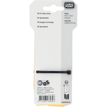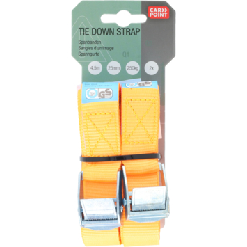 Avec la sangle d'arrimage Carpoint, vous pouvez sécuriser fermement les charges lourdes, en empêchant la charge de glisser. Le classeur à bagages peut être utilisé pour sécuriser le chargement sur une remorque, mais convient également pour empêcher une valise de s'ouvrir. Les sangles d'arrimage Carpoint ont une longueur de 4,50 mètres (chacune) et sont équipées d'une fermeture à pince. Cette fermeture garantit qu'une force suffisante peut être appliquée pour serrer la sangle d'arrimage sans qu'elle ne se desserre. En appuyant sur la fermeture, la pince est déverrouillée. La force de rupture de la sangle Carpoint est de 500 kilogrammes chacune, et avec cette sangle d'arrimage, vous pouvez sécuriser des charges jusqu'à 250 kilogrammes. La largeur de la sangle d'arrimage est de 25 millimètres et est livrée en lot de 2 pièces avec le label de qualité TÜV/GS.