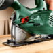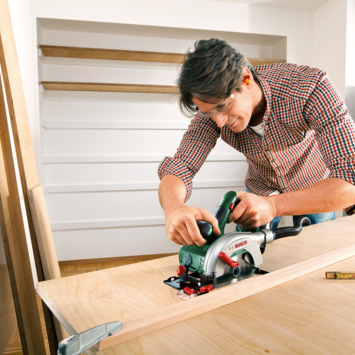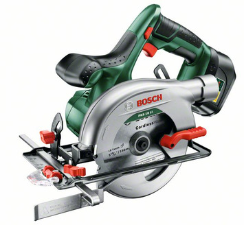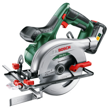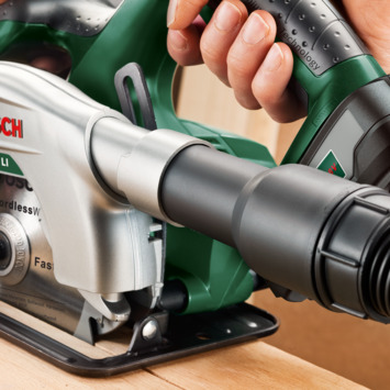 Grâce à sa forme compacte et à son design ergonomique, la scie circulaire sans fil Bosch PKS 18 LI est facile à utiliser. La poignée étrier et la seconde poignée à l’avant permettent un guidage sûr et extrêmement précis. L’utilisateur a une maîtrise parfaite de la scie et il peut se concentrer pleinement sur le suivi de la ligne de coupe. Il est aidé en cela par le dispositif CutControl, un guide transparent rabattable vers l’avant avec marquage de la ligne de coupe, et par le marquage à 90° et 45° sur la plaque de base. La profondeur de coupe et les angles d’onglet peuvent être réglés jusqu’à 45° de façon très rapide et très pratique. La puce Syneon Bosch intégrée, qui permet un temps de fonctionnement plus long par charge de batterie, garantit encore plus de puissance.