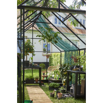 La serre Qube 812 est une serre pratique à l'aspect très attrayant. L'ensemble du cadre de la serre est composé d'un profilé carré en aluminium (Qube). Le verre de sécurité est fixé à l'aide d'un ruban adhésif et d'une bande de double vitrage. Cette serre est équipée de deux gouttières de 80 mm de large avec des pièces de raccordement pour les tuyaux de pluie. Un jeu de 2 tuyaux de pluie Ø 40 mm (jusqu'au niveau du sol) est disponible en tant qu'accessoire. La porte coulissante avec poignée a une hauteur de 180 cm et est équipée d'un rail de porte télescopique. Le seuil est très bas, ce qui rend la serre facilement accessible. Le Qube est recouvert d'un revêtement noir de série. La poutre faîtière, les gouttières et les fondations optionnelles sont disponibles en plusieurs parties connectables. En option Pour les 6 modèles Qube, une table de culture enduite de noir et un ensemble de tuyaux de pluie sont également disponibles en option. Ces tables ont une largeur d'environ 60 cm et leur longueur est égale à la dimension intérieure du côté le plus long. Une fondation en acier assortie est disponible séparément et constitue la base pour des années de plaisir de culture. L'utilisation d'une fondation stable est essentielle pour un fonctionnement optimal de la serre et constitue la base idéale pour des années de plaisir de culture!
