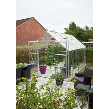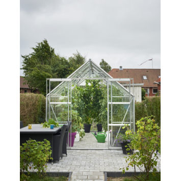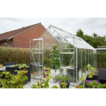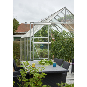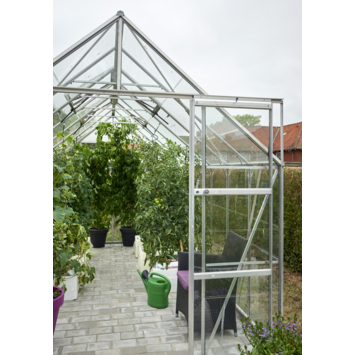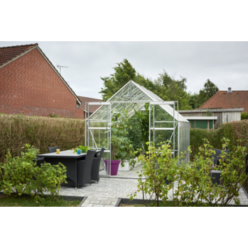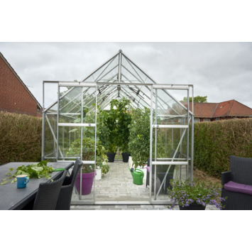 La Magnum est une serre de jardin très vaste et haute. Les doubles portes coulissantes offrent un bel accès large et agréable. Cette serre est disponible dans 3 longueurs en aluminium blanc ou teinte vert foncé et la paroi est composée de verres d’horticulture empilés ou de verres de sécurité (longues vitres). Les bases de fondation en option constituent une base solide. Aération Pour une aération optimale, tous les modèles sont pourvus de 4 lucarnes. Serre haute Grâce à sa hauteur de faîtage de 258 cm, la serre Magnum a une capacité importante. En combination avec des bases de fondation optionnelles en acier de 12 cm, cette serre robuste fait alors 270 cm de haut. Serrure de porte Les serres de jardin Magnum sont fournies standard d’une serrure de porte.