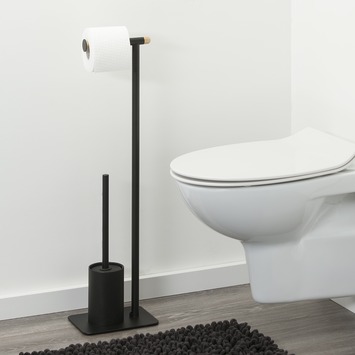 Pas besoin de vis pour fixer le valet de WC : bien solide sur son large socle, il se dépose là où vous l'utilisez. Il mesure 71,5 cm de haut sur 15 cm de large et 20 cm de profondeur et il combine une brosse WC et son support avec un dérouleur papier WC. Pour en profiter plus longtemps, nettoyez l'ensemble régulièrement avec un chiffon humide