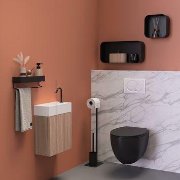 Le serviteur WC n'est qu'un des accessoires de la série Brix de Sealskin. En métal noir, certains avec des détails de bois, ces accessoires raffinés et originaux s'associent aussi bien à une salle de bain plutôt industrielle qu'à la salle de bain plus intemporaire. Cette série est également disponible en blanc.