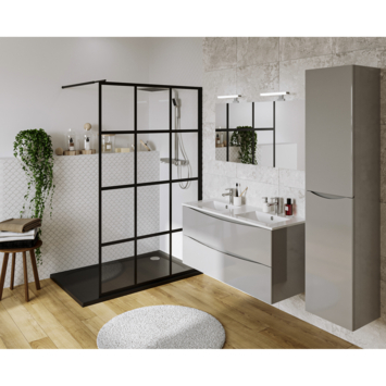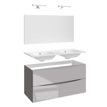 Set meuble de salle de bain Smiley Allibert 120 cm gris perle haute brillance avec double lavabo porcelaine et miroir avec éclairage Led