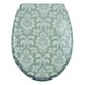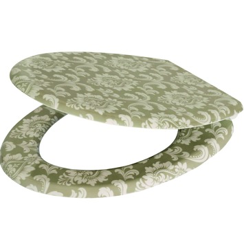 Un siège WC de Handson s'adapte à n'importe quel WC standard, il est confortable et bien solide. Disponible en différents designs modernes ou classiques, dont ce siège Jani de couleur verte avec des dessins baroques blancs, muni du système SoftClose.