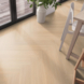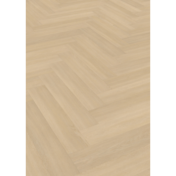 Le sol PVC clic Heringa chevron chêne naturel allie le charme intemporel du chevron avec la commodité et la durabilité du PVC. Grâce à la structure intégrale, le sol présente un aspect bois réaliste avec un grain tangible. Les planches ont une taille de 75,0 x 15,0 cm, ce qui permet de poser facilement un motif à chevrons élégant.