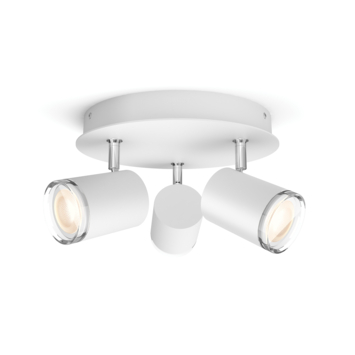 Ce spot apparent blanc et rond Philips Hue Adore est muni de trois spots LED GU10 White Ambiance. Ils éclairent toute votre salle de bains avec une lumière blanche chaude à froide facilement réglable à l'aide de l'interrupteur à variateur sans fil Philips Hue fourni ou avec l'application Hue sur votre smartphone ou tablette. Vous pouvez ainsi allumer et éteindre les spots, régler leur intensité et choisir parmi quatre recettes lumineuses pour mieux vous concentrer, lire, vous détendre et refaire le plein d‘énergie. Vous souhaitez découvrir plus de possibilités d'éclairage intelligent telles que des minuteries et routines automatisées ? Dans ce cas, connectez la lampe à un Philips Hue Bridge pour accéder à toutes les fonctions intelligentes de Hue. Cette lampe a été conçue avec une protection IP44, ce qui la rend étanche aux projections d’eau et parfaite pour la salle de bains.