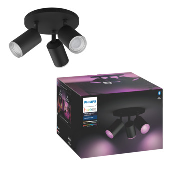 Le luminaire noir à trois spots Philips Hue Fugato est idéal pour créer une atmosphère parfaite dans le salon ou la chambre à coucher. Les trois spots smart, sur socle rond, sont ornés d'un anneau qui s'illumine en couleur. Ils sont équipés de lampes LED Ambiance qui fournissent une lumière avec 50.000 nuances blanches et jusqu'à 16 millions de couleurs. Avec l'application Philips Hue Bluetooth sur votre smartphone ou votre tablette, vous pouvez facilement allumer et éteindre la lumière, l'atténuer et changer de couleur. En vous connectant au Hue bridge, vous avez accès à toutes sortes d'autres fonctions intelligentes telles que la personnalisation des scènes d'éclairage, le minutage et bien plus encore.