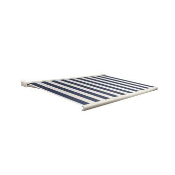 Le store Factor 20 est l'un des plus compacts sur le marché. En outre, il a été conçu à partir de la toile rayée couleur bleu/crème (D519) issue de la collection DomaSol®. Le store offre des possibilités de réglage uniques et grâce aux supports de fixation, il peut également être monté contre un mur ou au plafond. En outre, la gouttière en toile entièrement intégrée préserve le bel aspect de la toile et ceci durablement. L’armature de couleur blanc crème (RAL 9001) est équipée d’un moteur électrique Somfy fiable. La largeur maximale est de 400 cm avec une projection de 250 cm. Le store est monté jusqu'à 450 cm de large avec seulement deux supports. Pour les stores de plus de 450 cm de largeur, un support central standard est également fourni.