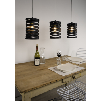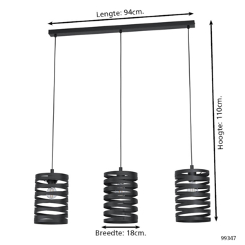 La suspension triple Cremella de Eglo pour l'intérieur a 3 abat-jours en fil métallique en forme de spirale montés sur une barre noire de 94 cm de long. Les abat-jours ont 18 cm de diamètre. La série comprend d'autres modèles. Les ampoules E27 ne sont pas fournies, préférez des ampoules LED !