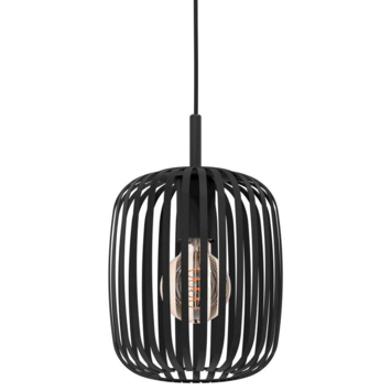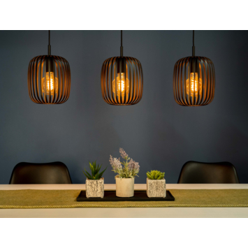 Cette suspension Romazzina est composée de trois abat-jour ronds en bandes de métal plat noir. Les bandes métalliques créent des jeux d'ombre et de lumière fascinants dès que la lampe est allumée. Le luminaire s'intègre parfaitement dans les intérieurs modernes, que ce soit dans la cuisine, le salon ou au-dessus de la table de la salle à manger. Les ampoules à filament illustrées ne sont pas comprises. Le luminaire convient pour toute ampoule avec culot E27.