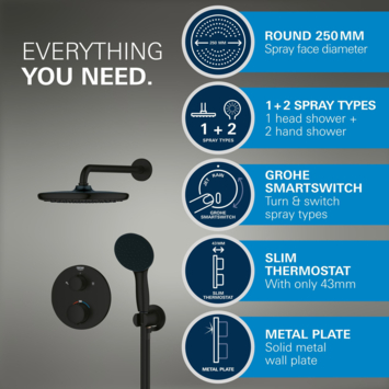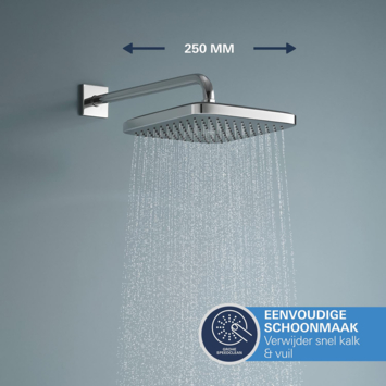 Avec le système de douche encastré Grohe Precision carré chromé, vous pouvez créer une douche durable dotée de fonctions utiles en un rien de temps. Cet ensemble tout-en-un offre confort, qualité et facilité d'utilisation ultime. Grohe TurboStat et Grohe assurent un jet d'eau constant et une température parfaite de 38°C. Grâce à la technologie Grohe Water Saving, vous pouvez économiser sans effort sur votre consommation d'eau et d'énergie sans sacrifier la qualité. Avec le pratique Grohe AquaDimmer, vous pouvez régler sans effort le débit d'eau et basculer en douceur entre la douche de tête et la douchette à main. La douche de tête a une taille généreuse de 250 mm et offre un jet Rain doux et relaxant. La douchette à main de 110 mm délivre le puissant jet Jet et le doux jet Rain que vous pouvez régler à votre guise grâce au cadran Grohe SmartSwitch. L'entretien est facile grâce à l'anticalcaire SpeedClean et à la finition Grohe Long-Life anti-rayures qui donne à l'ensemble de douche un bel éclat miroir longue durée. Grâce à l'installation facile à l'aide de Grohe FastFixation, vous pouvez installer le système intégré Grohe Precision carré chromé rapidement et de manière étanche.