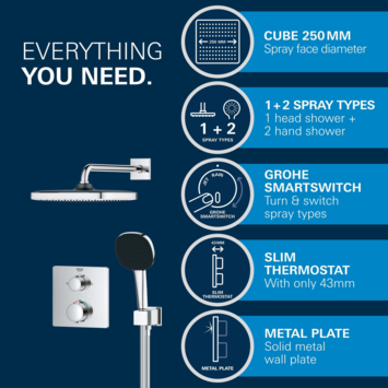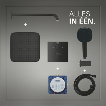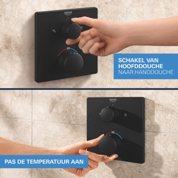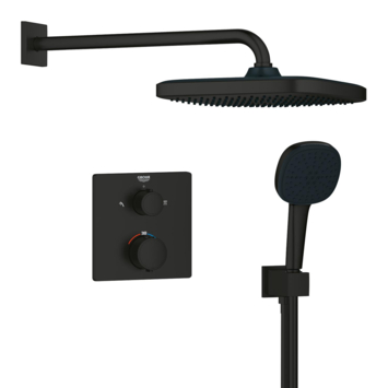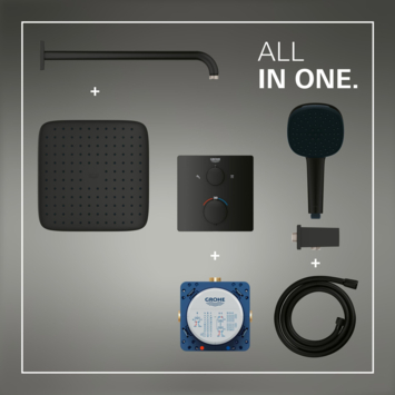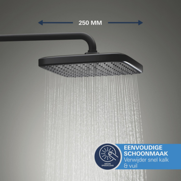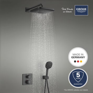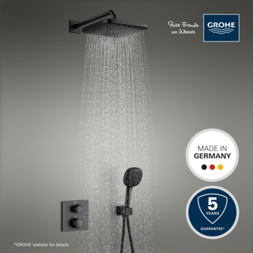 Avec le système de douche encastré Grohe Precision carré noir mat (Matte Black), vous pouvez créer une douche durable dotée de fonctions utiles en un rien de temps. Cet ensemble tout-en-un offre confort, qualité et facilité d'utilisation ultime. Grohe TurboStat et Grohe assurent un jet d'eau constant et une température parfaite de 38°C. Grâce à la technologie Grohe Water Saving, vous pouvez économiser sans effort sur votre consommation d'eau et d'énergie sans sacrifier la qualité. Avec le pratique Grohe AquaDimmer, vous pouvez régler sans effort le débit d'eau et basculer en douceur entre la douche de tête et la douchette à main. La douche de tête a une taille généreuse de 250 mm et offre un jet Rain doux et relaxant. La douchette à main de 110 mm délivre le puissant jet Jet et le doux jet Rain que vous pouvez régler à votre guise grâce au cadran Grohe SmartSwitch. L'entretien est facile grâce à l'anticalcaire SpeedClean et à la finition Grohe Long-Life anti-rayures qui donne à l'ensemble de douche un bel éclat miroir longue durée. Grâce à l'installation facile à l'aide de Grohe FastFixation, vous pouvez installer le système intégré Grohe Precision carré noir mat rapidement et de manière étanche.