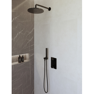 Voulez-vous une expérience de douche puissante et un look moderne ? Alors cette douche encastrée avec effet pluie en noir mat est faite pour vous. La douche de tête offre un jet large et doux, parfait pour se réveiller en douceur ou terminer la journée de façon relaxante. Avec la douchette à main, vous pouvez rapidement laver vos cheveux ou rincer la paroi de la douche. Grâce au sélecteur rotatif, vous pouvez facilement choisir entre les deux douches. La finition en noir mat donne à votre salle de bain un aspect élégant et se marie facilement avec d'autres détails noirs. Inclus dans ce système de douche pluie :