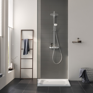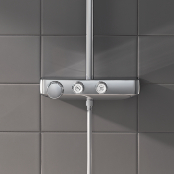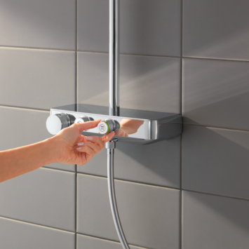 Le système de douche GROHE Euphoria SmartControl 260 transforme votre douche en un moment revigorant grâce à ses nombreuses options de jets et à ses fonctionnalités intelligentes. Grâce à la technologie innovante GROHE SmartControl, vous pouvez choisir entre la douche de tête et la douchette et passer facilement de l'un à l'autre. Vous pouvez également de basculer ou même de combiner les différents modèles de jet sur la douche de tête et de contrôler le débit d'eau via le cadran. Économiser de l'eau est plus facile que jamais - vous basculez le débit du plein débit vers EcoJoy. La douche de tête pivotante de 260 mm dispose de trois types de jets : le jet puissant et concentré, le jet SmartRain qui assure une détente totale et le jet Rain qui utilise toutes les buses de la douche de tête pour créer une sensation globale. Choisissez simplement lequel des trois vous souhaitez utiliser en tournant le bouton au centre de la tête de pulvérisation. La douchette à main de 110 mm offre trois options de jet : le jet relaxant Rain, le SmartRain écologique et le jet de massage énergisant. La technologie GROHE DreamSpray garantit que chaque buse de la tête fournit un débit égal pour toutes les options de pulvérisation. Le nettoyage des buses en silicone SpeedClean se fait sans effort - vous pouvez facilement essuyer le calcaire. Grâce à GROHE TurboStat, vous pouvez profiter d'une température d'eau constante pendant la douche. Avec GROHE SafeStop, vous pouvez régler une température maximale de 38°C, tandis que SafeStop Plus offre une limite optionnelle de 43°C. Pour plus de sécurité, GROHE CoolTouch garantit que le thermostat exposé ne sera jamais trop chaud au toucher. Pour plus de confort, il y a un plateau EasyReach pour que vous ayez toujours vos produits de toilette à portée de main. La finition chromée GROHE StarLight durable mais brillante rend l'ensemble magnifique. Et GROHE QuickFix rend l'installation rapide et facile : le support supérieur peut être ajusté pour réutiliser les trous de perçage existants.
