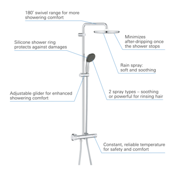 Faites l'expérience d'une plus grande liberté de mouvement et d'un plus grand confort lorsque vous prenez votre douche avec le système de douche GROHE Vitalio Start 250. Ce système exposé comprend une douche de tête, une douchette à main, un thermostat, une barre de douche avec bras de douche pivotant, un élément coulissant pour ajuster la douchette à main et un flexible de douche TwistFree. Le système de douche est conçu avec le GROHE TurboStat, qui vous permet de profiter de la température réglée en quelques secondes. Pour la douche, vous pouvez limiter la température de l'eau à 38°C grâce au Bouton GROHE SafeStop, afin d'éviter que les enfants ne règlent accidentellement la température à un niveau trop élevé. Vous pouvez régler le limiteur de température GROHE SafeStop Plus à 43°C comme option de sécurité supplémentaire. L'AquaDimmer de GROHE vous permet de passer sans effort de la douche de tête à la douchette à main, et vous pouvez également régler le volume d'eau en un clin d'œil. La douche de tête délivre un doux jet de pluie dont vous pouvez profiter pleinement grâce à GROHE DreamSpray, qui assure une répartition uniforme de l'eau sur chaque buse. La douchette est équipée d'un anneau en silicone ShockProof et délivre deux types de jet : le doux Rain Spray et le puissant Jet Spray. La pomme de tête et la douchette sont dotées de la technologie GROHE EcoJoy, qui permet d'économiser de l'eau, pour une expérience de douche confortable et durable. Les trous de pulvérisation SpeedClean anti-calcaire sont conçus pour essuyer facilement tout dépôt de calcaire avec le doigt, garantissant une facilité de nettoyage optimale. La finition chromée GROHE Long-Life Finish résistante aux rayures permet au système de douche GROHE Vitalio Start 250 de conserver son aspect impeccable pendant des années. Pour plus de commodité, ajoutez également le bac GROHE EasyReach (26362LN1) pour garder le savon et le shampoing à portée de main.
