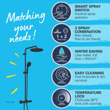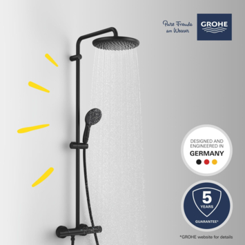 Le système de douche GROHE Vitalio Start 250 promet une liberté de mouvement accrue et un confort optimal. Ce système comprend une douche de tête, une douchette à main, un thermostat, une barre de douche avec bras de douche pivotant, un élément coulissant pour ajuster la douchette à main et un flexible de douche TwistFree. Le système de douche est conçu avec le GROHE TurboStat, qui vous permet de profiter de la température réglée en quelques secondes. Pour la douche, vous pouvez limiter la température de l'eau à 38°C grâce au Bouton GROHE SafeStop, afin d'éviter que les enfants ne règlent accidentellement la température à un niveau trop élevé. Vous pouvez régler le limiteur de température GROHE SafeStop Plus à 43°C comme option de sécurité supplémentaire. L'AquaDimmer de GROHE vous permet de passer sans effort de la douche de tête à la douchette à main, et vous pouvez également régler le volume d'eau en un clin d'œil. La douche de tête délivre un doux jet de pluie dont vous pouvez profiter pleinement grâce à GROHE DreamSpray, qui assure une répartition uniforme de l'eau sur chaque buse. La douchette est équipée d'un anneau en silicone ShockProof et délivre deux types de jet : le doux Rain Spray et le puissant Jet Spray. La pomme de tête et la douchette sont dotées de la technologie GROHE EcoJoy, qui permet d'économiser de l'eau, pour une expérience de douche confortable et durable. Les trous de pulvérisation SpeedClean anti-calcaire sont conçus pour essuyer facilement tout dépôt de calcaire avec le doigt, garantissant une facilité de nettoyage optimale.
