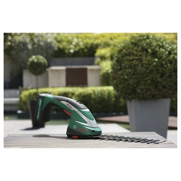 Vous pouvez désormais entretenir votre buis très facilement avec la cisaille à gazon et à box Bosch ASB 10.8 Li. Grâce à la puissante batterie, vous n'êtes pas dépendant des rallonges. Cette batterie Litium-Ion dure plus d'une heure et demie et est complètement chargée en 3,5 heures. Cette cisaille à arbustes Bosch est livrée avec une lame de 20 cm et des cisailles à gazon ; cependant, d'autres types de lames conviennent également à cette machine. Le couteau à buis a une largeur de coupe allant jusqu'à 8 mm.