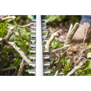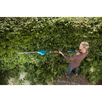 De heggenschaar op stok bevalt meer dan prima, degelijk, niet te zwaar en behoorlijk sterk: takken die tussen de tanden passen worden goed afgeknipt en dat op 3 m hoogte terwijl je zelf op de grond staat! Ook op de ladder is prima werken omdat het gewicht alleszins meevalt.