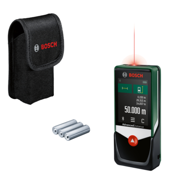 Bosch a doté son télémètre laser d’un équipement unique sur le segment du bricolage. Le grand écran tactile couleur de 2,4" fait partie des points forts sans équivalent. Un simple geste du doigt suffit pour naviguer dans le menu. Le capteur d’inclinaison est un autre point fort du AdvancedDistance 50 C. Il peut être utilisé pour déterminer la pente de rampes d’escalier, par exemple. Le capteur peut indiquer un angle d’inclinaison compris entre 0 et 360 degrés avec une précision de 0,2 degré. Cette fonction fait de l’appareil un inclinomètre. Mais aussi un niveau à bulle numérique qui s’utilise dans les deux axes (gauche/droite et avant/arrière). La mise à niveau du niveau à bulle s’effectue par le biais d’une cible graphique. La plaque de butée pratique située au pied du télémètre laser se déplie à 90 ou 180 degrés. Cela permet de bien plaquer le télémètre laser contre les bords et de bien mesurer à partir des angles. En mode de mesure continue, le AdvancedDistance 50 C affiche en permanence la distance instantanée qui sépare son propre bord de référence et la surface vers laquelle le faisceau laser est pointé. Il indique la plus petite et la plus grande des distances de la mesure en cours.