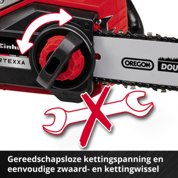 La tronçonneuse sans fil FORTEXXA 18/30 Einhell est un outil puissant de la gamme flexible Power X-Change. Avec son moteur sans charbon Einhell plus durable et plus puissant qu’un moteur à charbon classique, le modèle FORTEXXA est l'outil idéal quand il s’agit de couper les branches épaisses d’arbres fruitiers et les rameaux denses de feuillus et de conifères. Avec sa chaîne et son guide-chaîne de qualité OREGON, même les branches les plus épaisses n’opposent aucune résistance à la tronçonneuse FORTEXXA. Les modèles de tronçonneuses sans fil sont également très performants pour couper les bois de construction, bois équarris et bois de chauffage. L’ajustement de la tension de la chaîne et son changement s’effectuent simplement et sans outil, facilitant ainsi la manipulation de l’outil. L’attrape-chaîne et la protection anti-rebond avec frein d’arrêt immédiat permettent une utilisation en toute sécurité, la grande ouverture de remplissage de l’huile et la lubrification automatique facilitant quant à elles l’entretien. La butée dentée en métal est robuste, et la poignée ergonomique à surface Softgrip assure une prise en main ferme et sûre. L’outil fonctionne avec une batterie 18 V Power X-Change. La gamme innovante Power X-Change Einhell se démarque par sa puissance élevée et sa flexibilité maximale. Parmi tous les appareils de cette gamme Einhell, les batteries lithium-ion sont interchangeables à l’infini. Chaque batterie Power X-Change peut être utilisée avec tous les appareils de cette même gamme. La vitesse de la chaîne s’adapte en fonction de l’utilisation : on peut ainsi passer du mode pleine puissance (8 m/s) au mode ECO (6 m/s). La vitesse réduite de la chaîne en mode ECO augmente la durée d'utilisation de la batterie. L'outil est vendu sans batterie ni chargeur, ces accessoires étant disponibles séparément en plusieurs puissances, notamment dans le Starter Kit, très pratique.